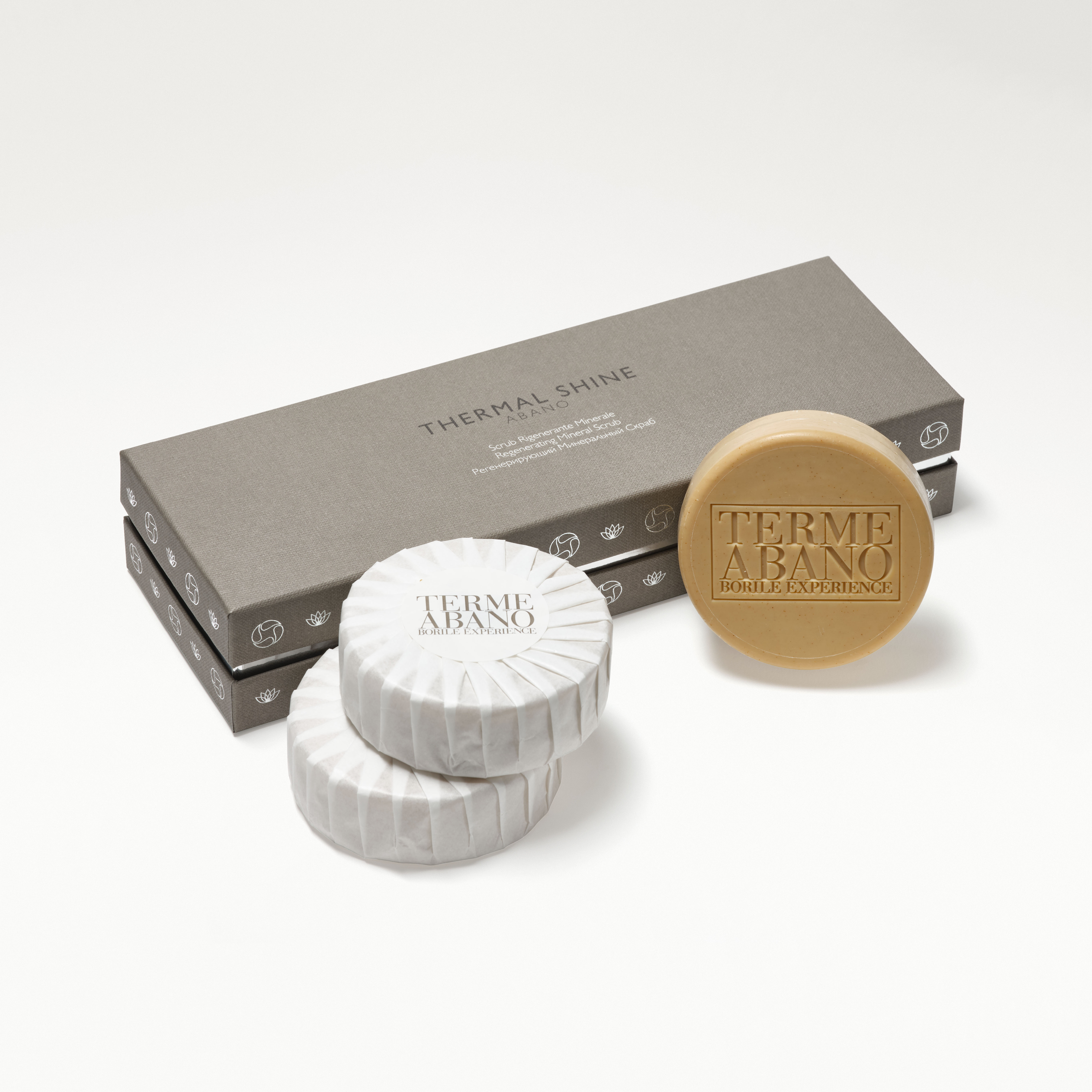 The regenerating mineral scrub from the Thermal Shine line is a solid scrub ideal for deep cleansing with a purifying and smoothing effect, enriched with Abano Thermal Water, clays from the area rich in minerals and vegetable granules that renew and purify the skin of the body. It is recommended to use Thermal Shine nourishing body cream after this solid thermal scrub.