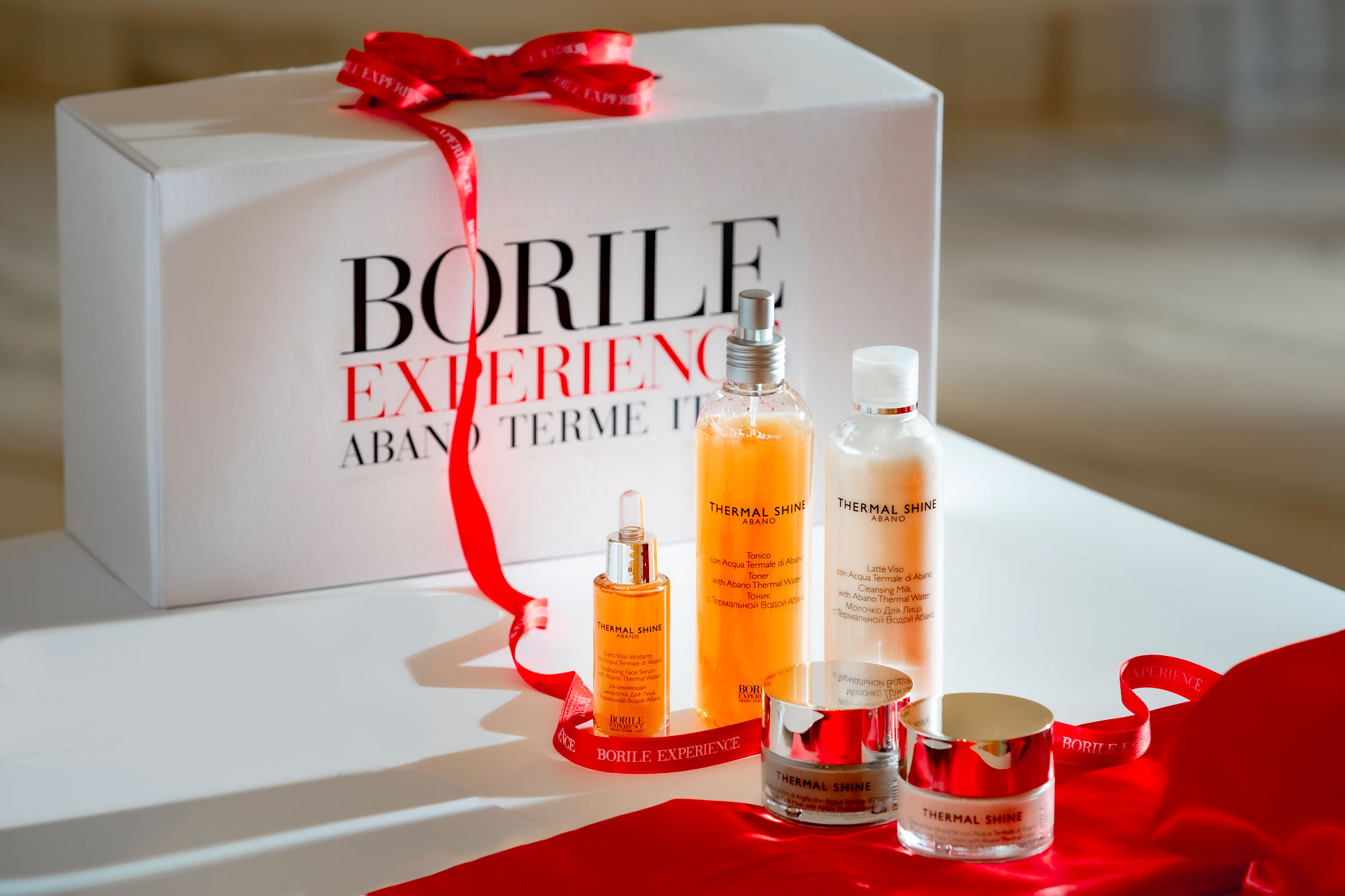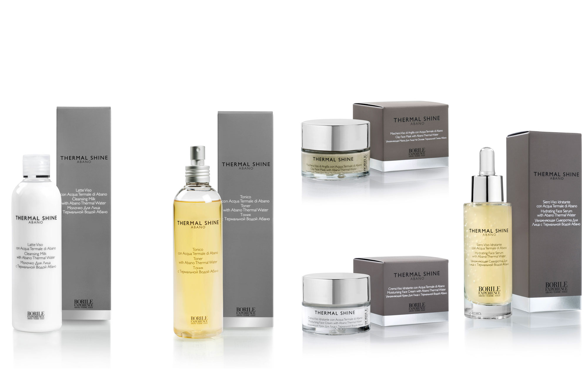 The face and body cosmetic products of the Thermal Shine line are formulated using Abano Terme Thermal Water rich in its precious and natural Mineral Salts associated with natural antioxidant actives with mud and clay. These precious natural components enhance and complement the properties and effects on the epidermis, improving elasticity, radiance, hydration and nourishment.